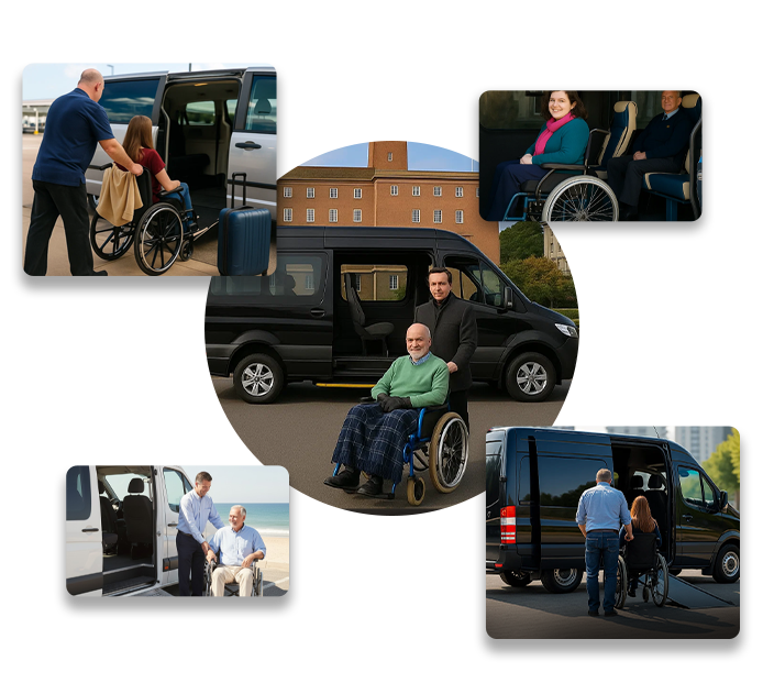 Fully Accessible Vehicles – Purpose-built for wheelchair users and passengers with mobility needs. Every vehicle includes ramp access, secure restraints, and a spacious interior to ensure a smooth and dignified journey.